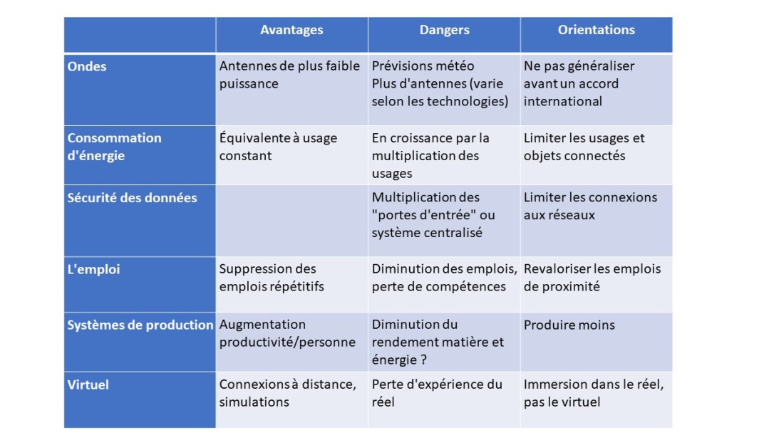 Comment ? en nous appuyant aussi bien sur des travaux pro 5G qu’anti 5G. Nous identifions cinq enjeux : les ondes électromagnétiques, la consommation d’énergie, la sécurité des données ; la transformation des systèmes de production et l’emploi et l’impact du virtuel.